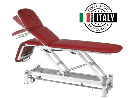 Lettino elettrico per fisioterapia a tre sezioni. La speciale testiera permette il massimo confort del paziente adattandosi all'ergonomia del corpo. Altezza variabile tramite motore elettrico da 8000 N attivabile con comando perimetrale.