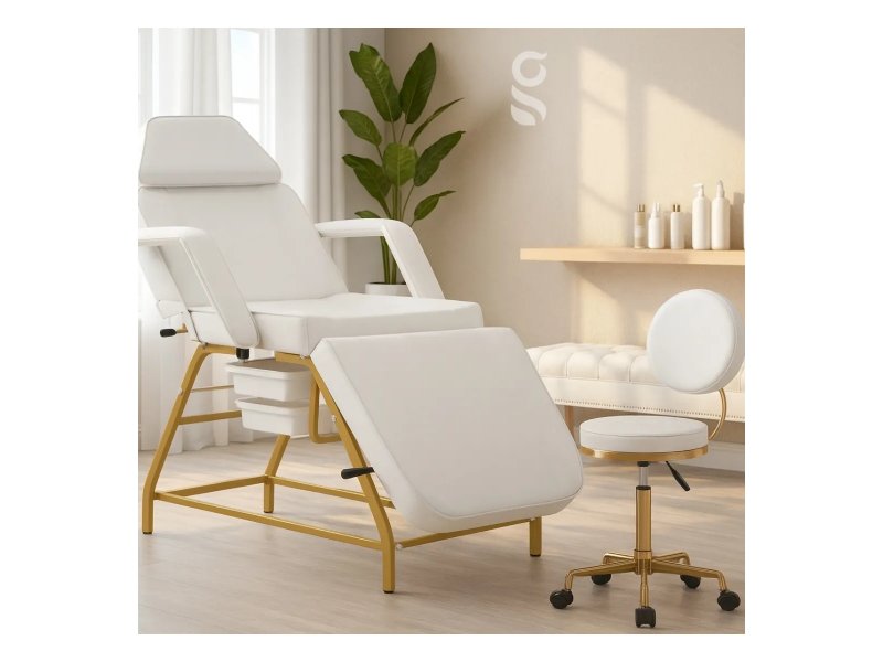 Lettino estetista professionale 3 snodi con sedia oro, comfort e design esclusivo per trattamenti perfetti in centri estetici e spa di lusso.