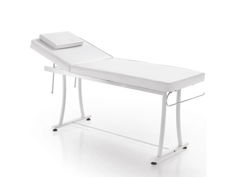 Lettino massaggio professionale con testata regolabile, rivestimento in eco pelle e porta rotolo integrato, ideale per centri estetici e trattamenti di alta qualità.
