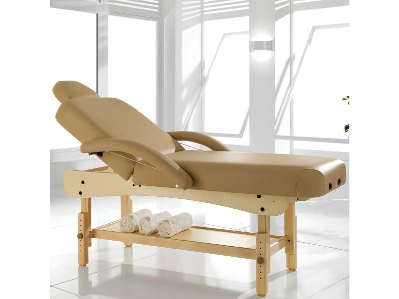 Lettino massaggio in legno massello, testata regolabile e cuscino imbottito per comfort e stabilità professionale in spa e centri estetici.