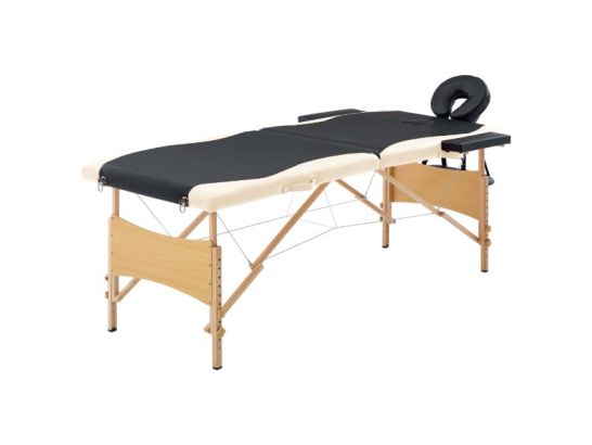 Lettino Massaggio Pieghevole in Legno Nero e Beige, ideale per professionisti e principianti. Comfort e praticità in un design elegante e portatile.