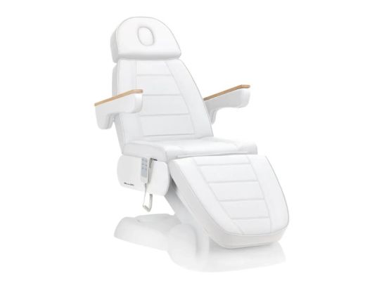 Poltrona estetica elettrica a 3 motori con telecomando, design elegante in pelle sintetica bianca per massimo comfort e praticità in centri estetici e spa professionali.