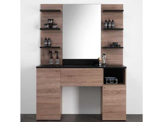 Postazione Barbiere in Legno con Ampio Specchio Mensole e Cassetti