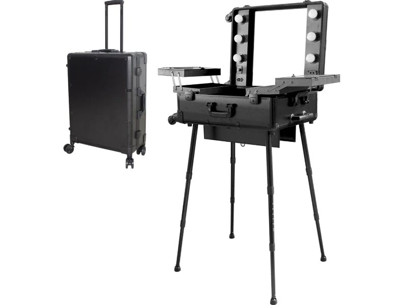 Postazione make up professionale compatta e richiudibile a trolley, con specchio e 6 luci LED per un'illuminazione perfetta ovunque tu sia.