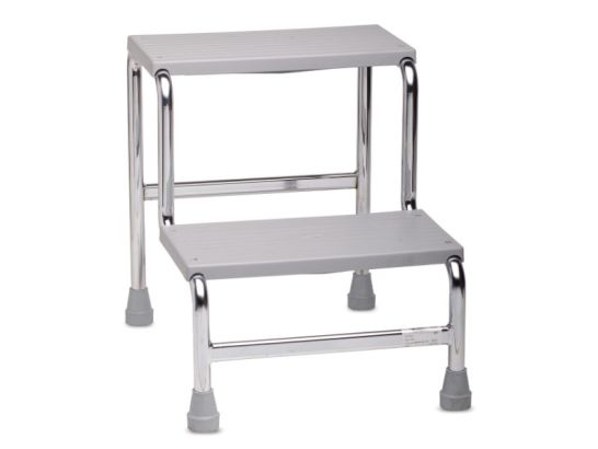 Scaletta a 2 gradini in acciaio cromato, resistente fino a 150 kg. Design compatto e sicuro, ideale per lavori domestici e professionali. Leggera e facile da riporre.