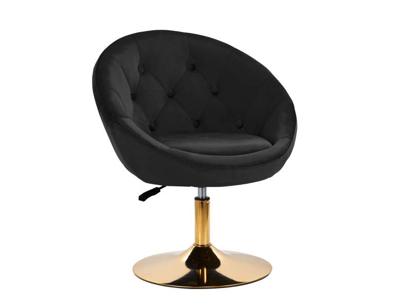 Sedia girevole in velluto nero con base dorata, design elegante e comfort ergonomico, ideale per ambienti professionali e domestici raffinati.