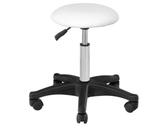 Sgabello cosmetico idraulico con base stabile a cinque stelle e ruote silenziose, regolabile in altezza per comfort e mobilità nei centri estetici e saloni di bellezza.