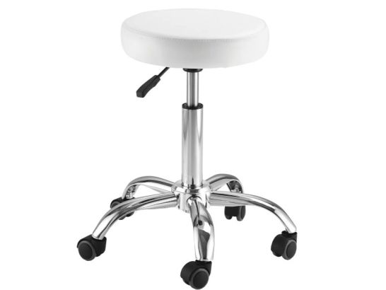 Sgabello estetista bianco regolabile in eco pelle con rotelle, ergonomico e funzionale, ideale per professionisti di estetica e benessere.