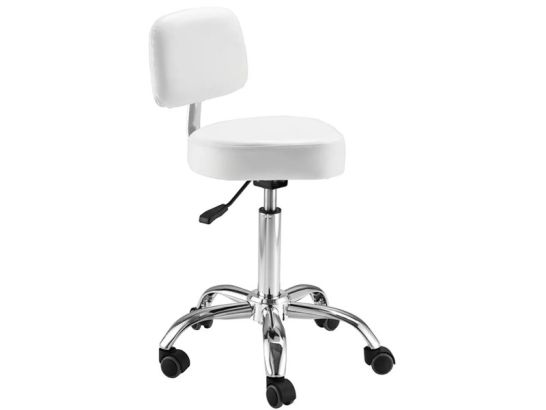 Sgabello professionale regolabile con schienale ergonomico e pompa idraulica, ideale per estetiste e professionisti del benessere. Comfort, mobilità e design in un unico prodotto.