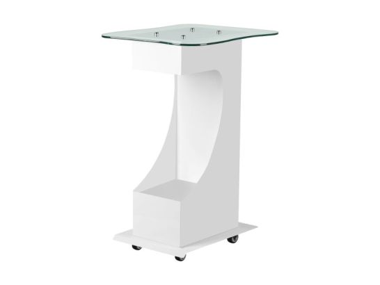 Tavolo cosmetico in metallo e vetro con ruote bloccabili per dispositivo