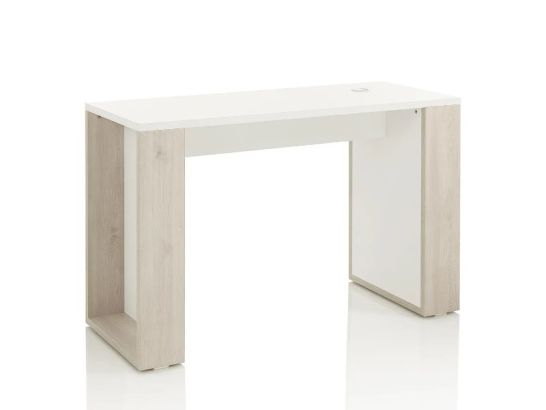 Tavolo manicure in legno larice con vani laterali e fori passacavi, design elegante e pratico per centri estetici e professionisti nails. 120x50x85 cm.
