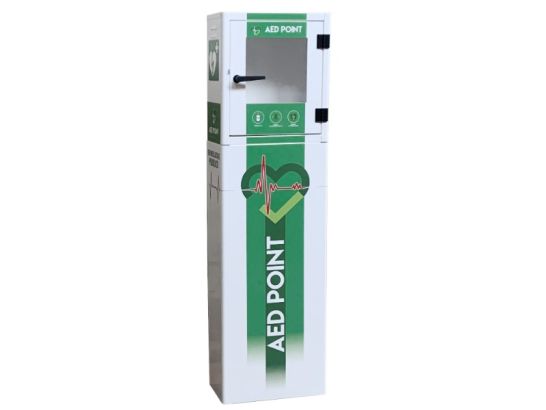 Teca resistente in acciaio per defibrillatore, con piantana supporto. Sicurezza e accessibilità garantite in ogni ambiente. Pronta per emergenze!