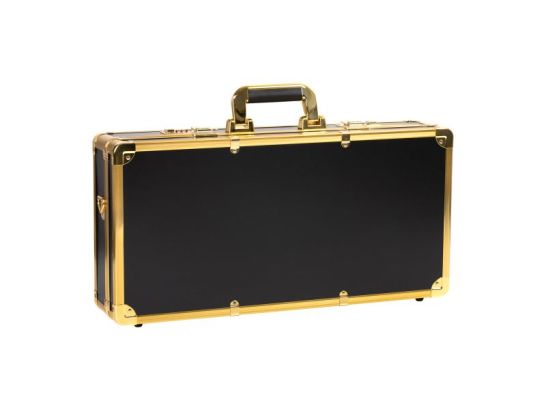 Valigia da barbiere in alluminio con doppia serratura, tracolla regolabile e profili dorati. Sicura, elegante e pratica per organizzare e trasportare tutti i tuoi strumenti professionali.