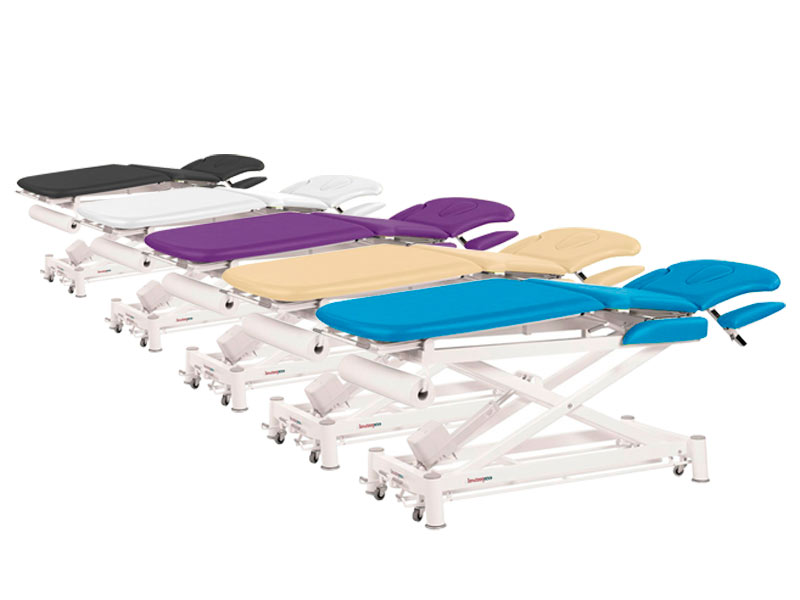 Elektrische behandeltafel 3-delig met schaarvoet en ergonomische hoofdsteun. Elektrische hoogteverstelling met een motor gestuurd door voetrails. Afmetingen : 200 x 62 cm.