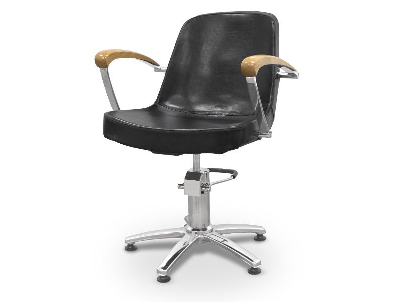 Het heeft een chromen stervormige basis die totale stabiliteit biedt en armleuningen met contrasterende houtafwerkingen die de klant extra comfort bieden.