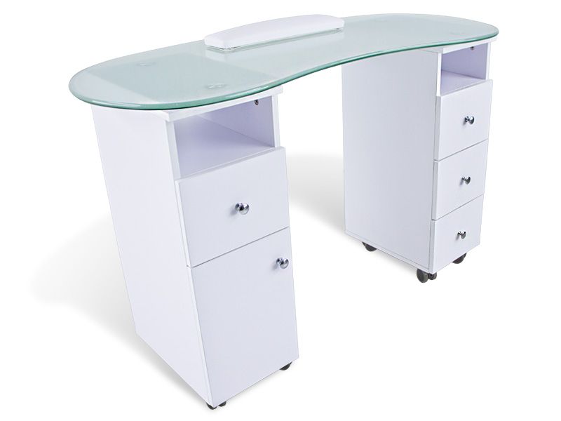 Manicuretafel voor schoonheids- en schoonheidscentra. Het heeft een modern en functioneel ontwerp, met een witte afwerking en een doorschijnend glazen werkblad. Het heeft lades om verschillende gebruiksvoorwerpen en werkaccessoires op te bergen.