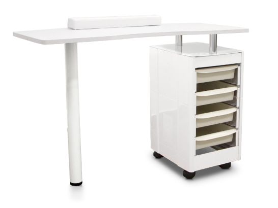 Eenvoudige en praktische manicuretafel, voor schoonheids- en schoonheidscentra, met een open zijkolom met 4 grote lades voor snelle en open toegang tot werkbenodigdheden. Inclusief polssteunkussen.
