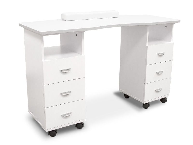 Praktische manicuretafel ideaal voor schoonheids- en esthetische centra met in totaal 6 lades en een groot werkgebied met meegeleverde mobiele polssteun. Uitgerust met wielen om de mobiliteit te vergemakkelijken.