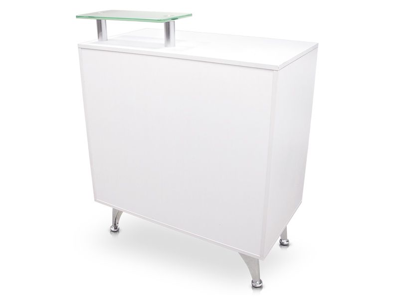 Nieuwe toonbank voor esthetische en schoonheidssalons die opvalt door zijn praktische en functionele ontwerp en brede waaier aan mogelijkheden. Het bovenste gedeelte heeft een kleine doorschijnende glazen plank die op twee kleine metalen kolommen rust.