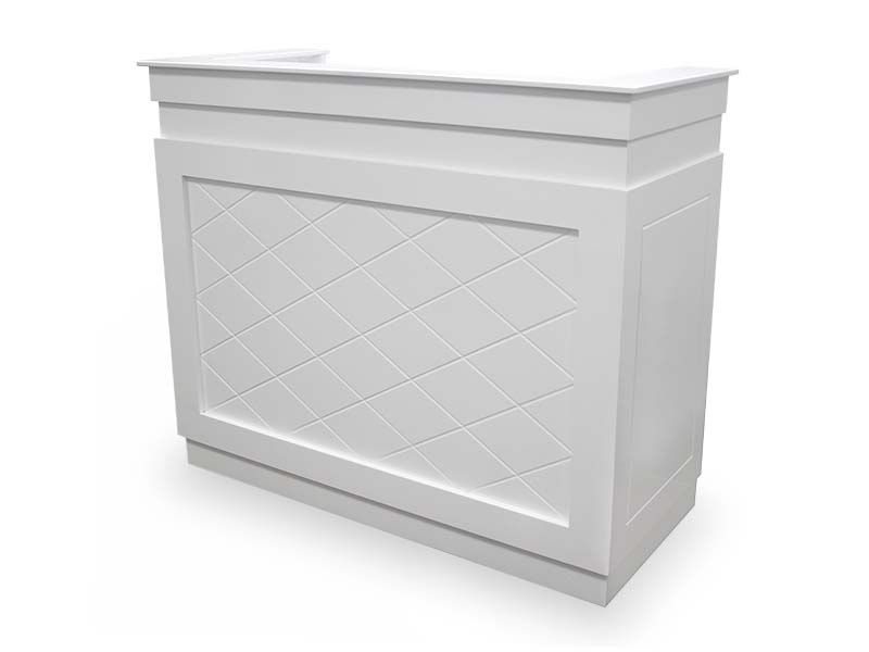 Receptiebalie in klassieke stijl voor schoonheidscentra, klinieken, kappers, enz. Het hoofdgedeelte van de balie is gemaakt van wit gelakt hout, waardoor het een meubelstuk is dat in de meeste centra heel gemakkelijk te combineren is. Aan de voorkant heeft het een decoratie met reliëfs, waardoor het een vleugje elegantie krijgt.
