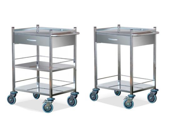 Trolley van roestvrij staal, bovenblad met rand aan 3 zijden, ondervlak(ken) met reling aan 3 zijden en bovenste lade.