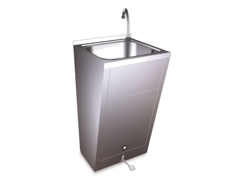 Wastafel met voetschakelaar. Gemaakt van roestvrij staal met gepolijste afwerking. De watertemperatuur is warm / koud instelbaar middels een terugslagmengkraan. Installatie van inlaat- en afvoerleiding is vereist.