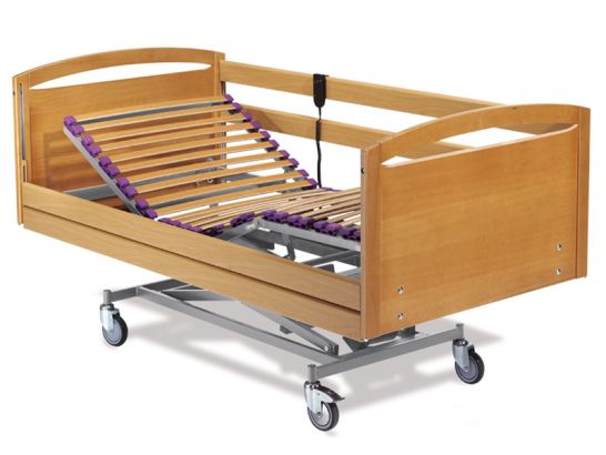Hoog-laag elektrisch ziekenhuisbed 190 cm lang met houten frame.