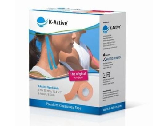 Fita de algodão porosa e respirável com a mesma espessura da pele (ligadura neuromuscular). Novo formato: rolos de fita K-Active Kinesiology Tape embalados em caixas individuais. Embalagem com rolos.