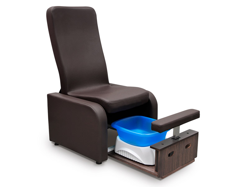 Cadeira de pedicure com banheira de hidromassagem localizada em suas gavetas de madeira removíveis. Apoio para os pés ajustável em altura.