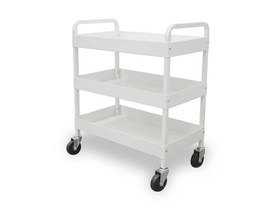 Carrinho auxiliar para salões de beleza e cabeleireiro em aço branco. Possui três grandes gavetas que permitem uma ótima arrumação, além de 4 rodas giratórias 360º, 2 delas com sistema de travamento.