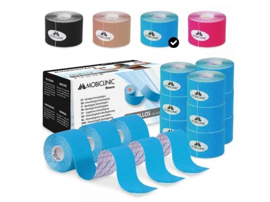 - 12 rolos de vendas kinesiológicas em diversas cores.
