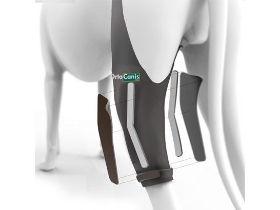 - Duas talas laterais anguladas em alumínio (interna e externa) que se adaptam à forma do joelho do cão.