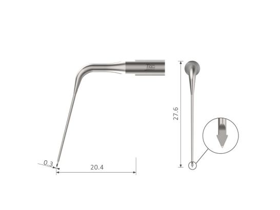 - Formato da ponta: lança inclinada a 90°, ideal para alcançar regiões difíceis sem causar danos ao tecido circundante.
