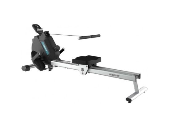 Máquina de remo Drumfit Rower 5500 com resistência magnética e 16 níveis, treino silencioso e eficiente para casa, com display LCD e suporte para dispositivos.