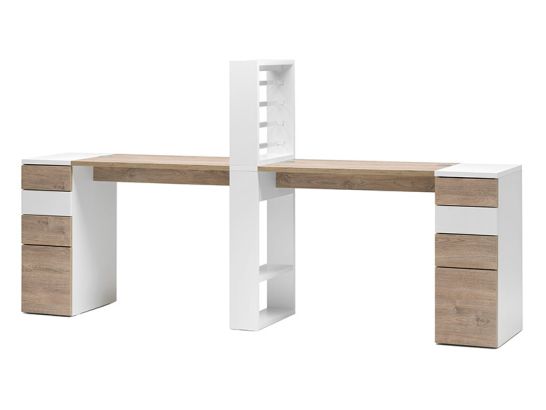 Cada lado exterior da mesa é equipada com cómoda com quatro gavetas com abertura push-pull, perfeita para organizar ferramentas e produtos, mantendo o posto de trabalho arrumado e funcional. As frentes das gavetas estão disponíveis nos acabamentos Carvalho, Cimento ou Branco, combinadas com o tampo para criar um visual coordenado.
