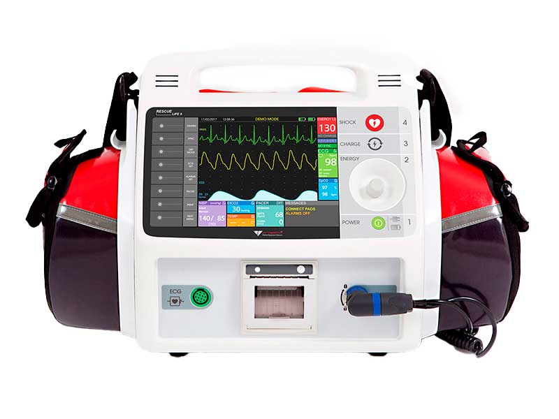 Monitor Desfibrilador RESCUE LIFE 9: ECG 12 derivações, marcapasso e monitoramento de temperatura. Ideal para emergências médicas, compacto e fácil de usar.