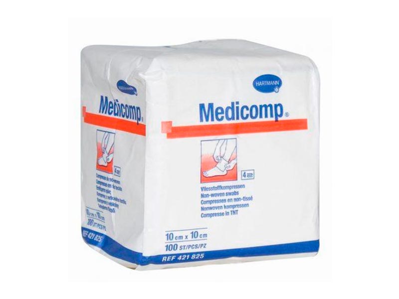 - A sua composição 70% rayon e 30% poliéster conferem-lhe uma estrutura semelhante às almofadas de algodão e tornam o Medicomp um produto particularmente absorvente, macio e respirável. Medicomp não carrega ligantes e alvejantes. Medicomp é usado e aplicado como uma compressa de algodão, mas com mais absorção do que uma gaze convencional.