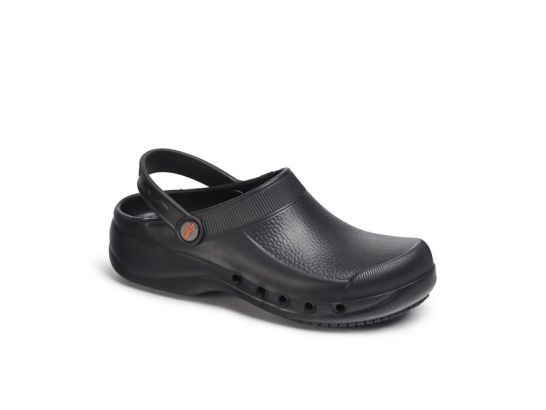 Zueco EVA Plus negro, antibacteriano e anatômico, ideal para longas jornadas. Solado antiderrapante e fácil limpeza, para conforto e segurança em qualquer ocasião.