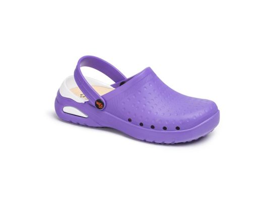 Zueco EVA ultraleve, antibacteriano e anatômico. Ideal para conforto e segurança no trabalho. Cor violeta vibrante para estilo no dia a dia. Tamanho 35.