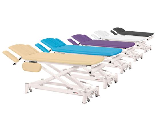 Masă de tratament hidraulic 2 secțiuni cu bază foarfecă și brațe rabatabile fixe. Dimensiuni : 207 x 62 cm. Reglarea înălțimii cu pompă hidraulică acționată de un comutator de picior mecanic.