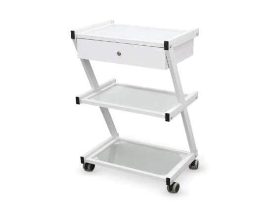 Acest carucior estetic este un mobilier auxiliar ideal pentru saloanele de estetica si infrumusetare. Are un sertar care se poate încuia, 3 rafturi din sticlă translucidă și roți pentru a-l transporta cu ușurință oriunde este nevoie de serviciu. Finisaj alb pe structura metalica.