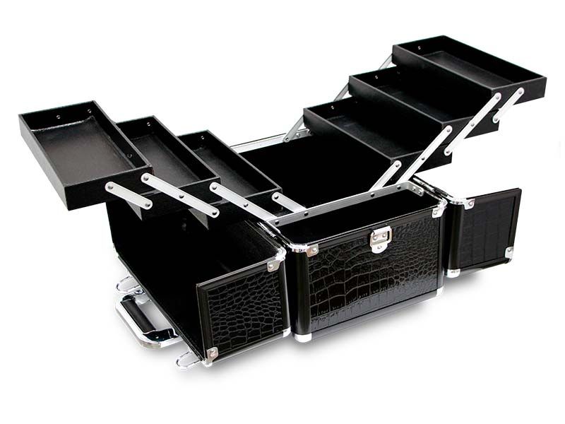 Geantă de machiaj tapițată modernă și fermecătoare, cu efect de crocodil și finisaje metalice de înaltă calitate. Se remarcă prin deschiderea sa mare derulantă pentru un acces mai ușor la toate tăvile și un interior mare în care poți transporta toate produsele tale de machiaj confortabil și în siguranță.