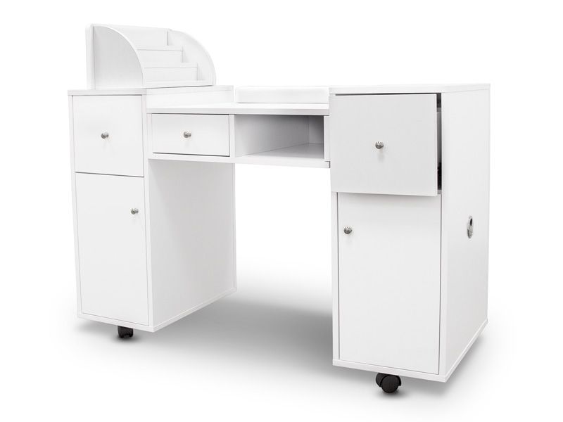 Masă de manichiură cu sertare multiple, raft polonez separat și pernă de sprijin pentru încheietura mâinii. Mânerele cromate pe sertare și uși. Echipat cu roți.
