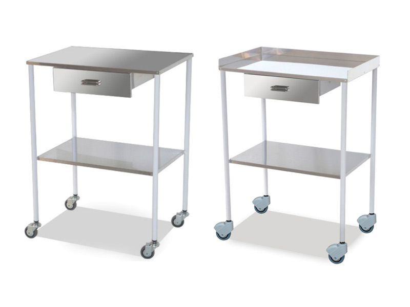 Avlastningsbord tillverkat i vitmålade stålrör, med två hyllor i rostfritt stål och låda i rostfritt stål.
