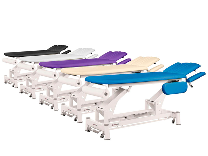- Electric height adjustment with a motor controlled by foot rails.