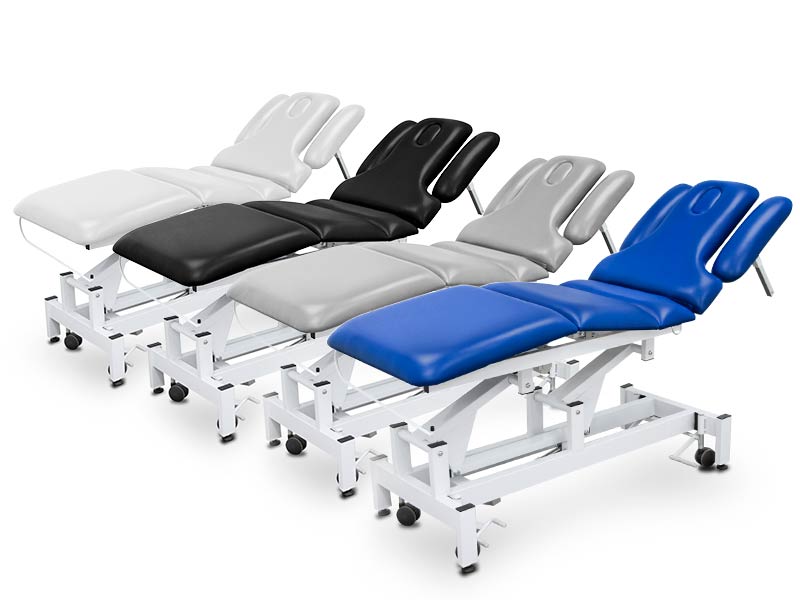 This electric massage table includes 3 motors that allow to adjust, through theprovided hand control, its height, the inclination degree of the backrest as well as the height of the leg section’s fold.