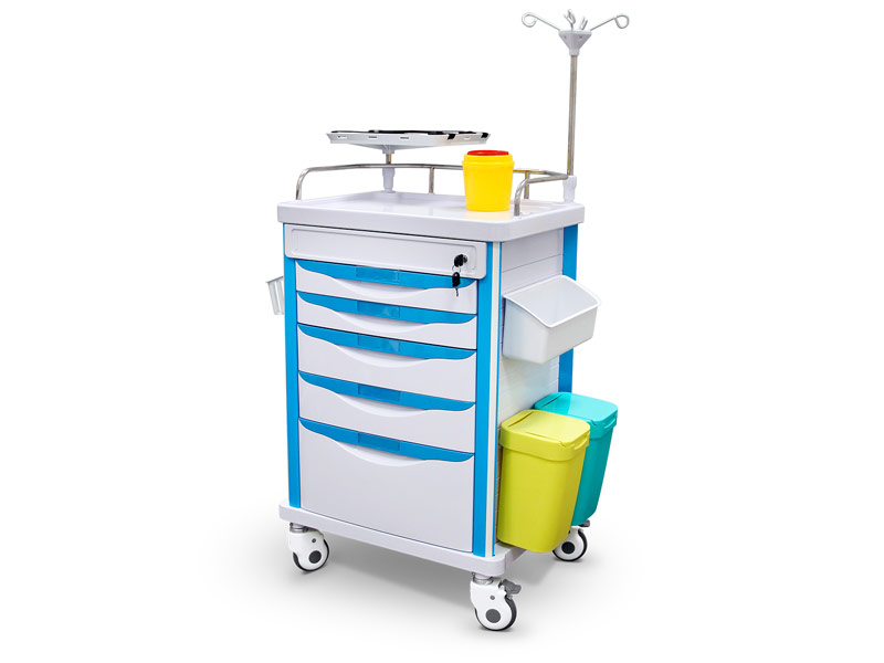 This emergency cart has a cardiac table, defibrillator tray, height-adjustable IV pole and removable side tray. In addition, it has 5 drawers with large capacity dividers, baskets, waste bins and a container for sharp objects. It has high-resistance wheels, 2 of them with brakes.