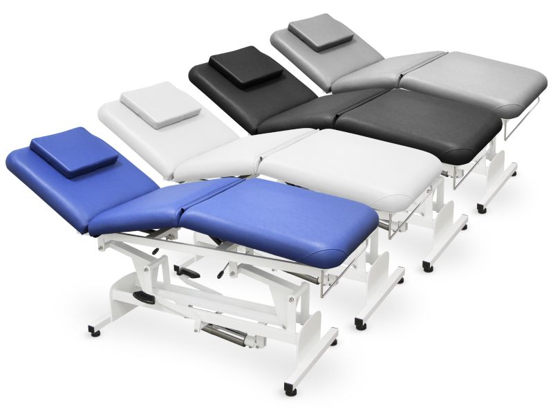 Sensational multidisciplinary hydraulic stretcher with 3 sections with central fold and toilet roll holder. Pedal on the base, accessible from both sides, to regulate the general height of the stretcher. Steel frame for maximum stability and strength. Upholstery available in various colors.