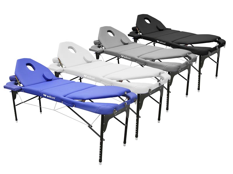 Wellcore folding table in black aluminum with double folding backrest and adjustable height. High quality finishes and great features. Upholstered in leatherette and available in various colors. High resistance against splashes of both water and oil.