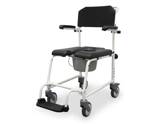 Chair with removable toilet and wheels for people with reduced mobility, made of high-quality materials such as aluminum and plastic, which give the chair high resistance to natural deterioration and continued use. Designed to be used both for domestic use and in places and medical centers where there are patients with these needs, helping and increasing the independence of users when using the bathroom or shower.